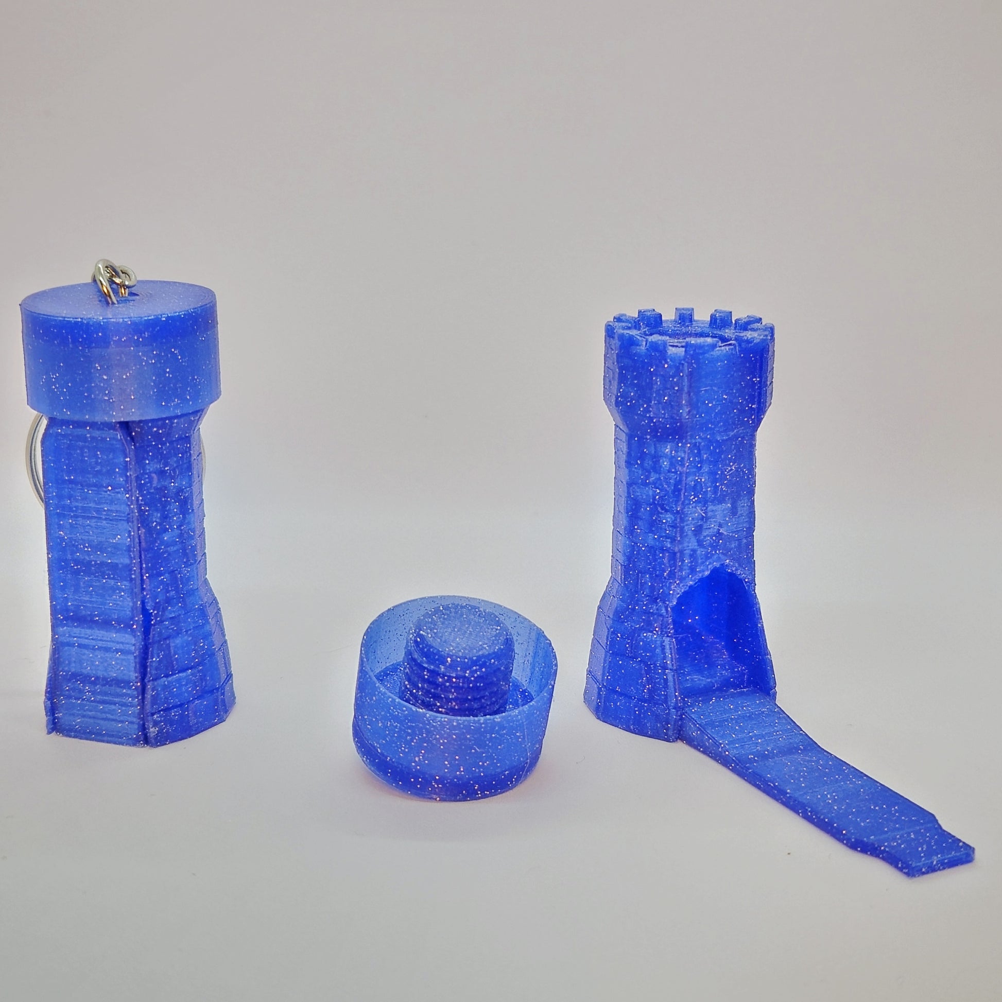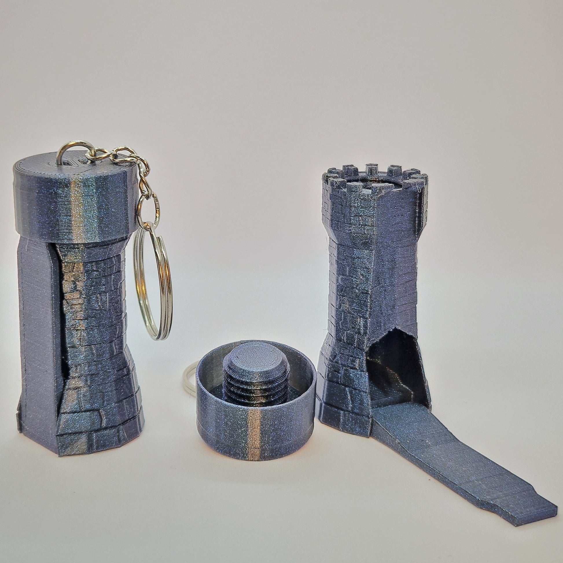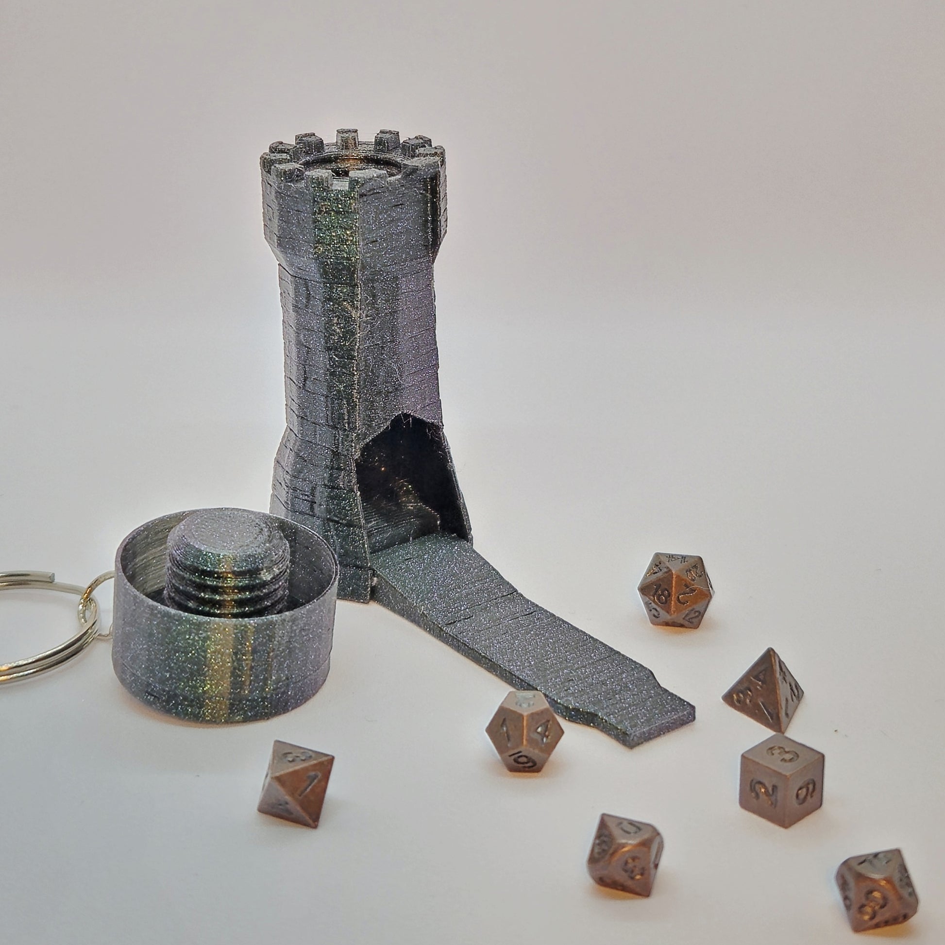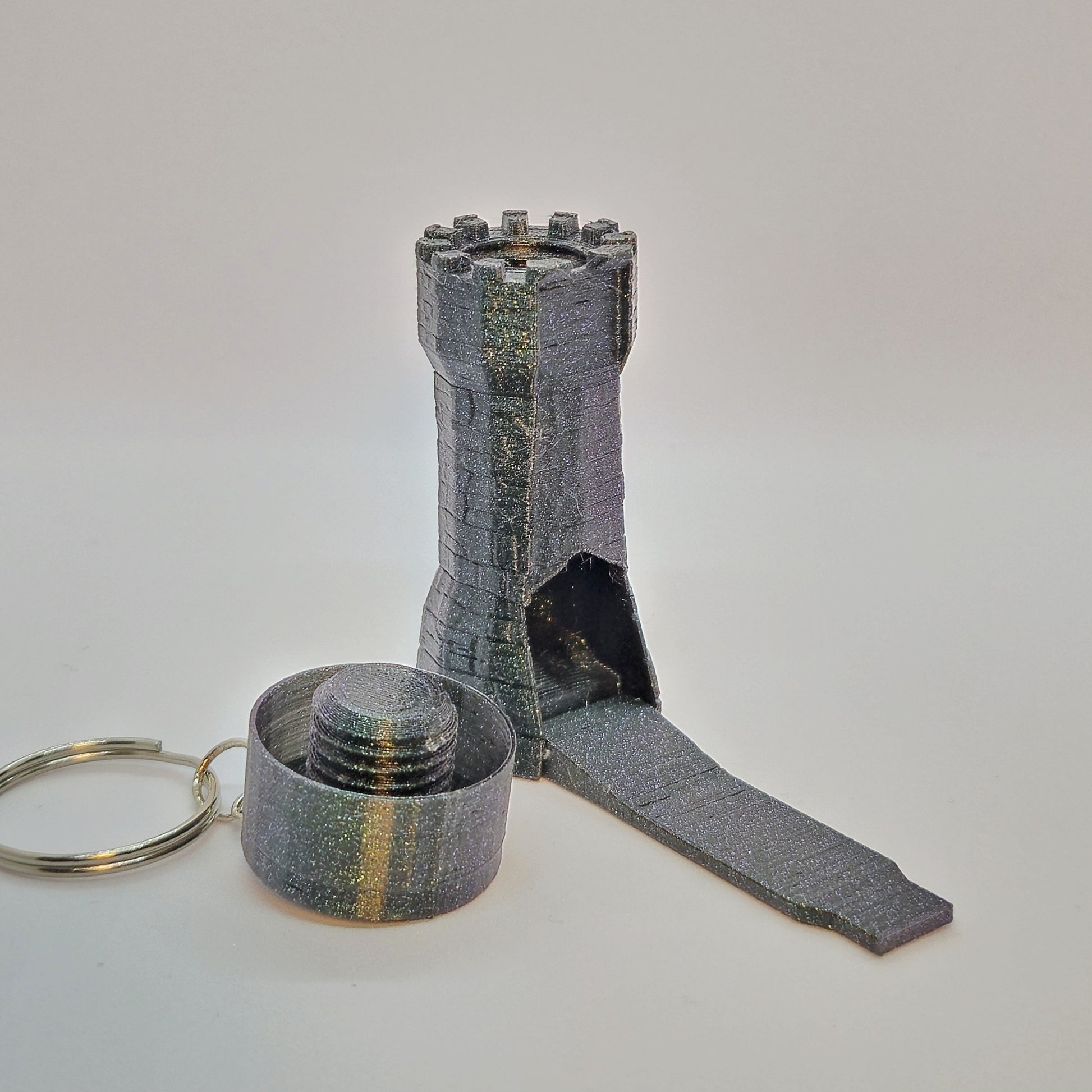 This compact dice tower doubles as a secure container for a mini metal dice set (D20 diameter max. 1cm), with a threaded screw-top to keep your dice safe. Designed for convenience, it comes equipped with a sturdy keychain so it's always within reach. Despite its size, it rolls true.