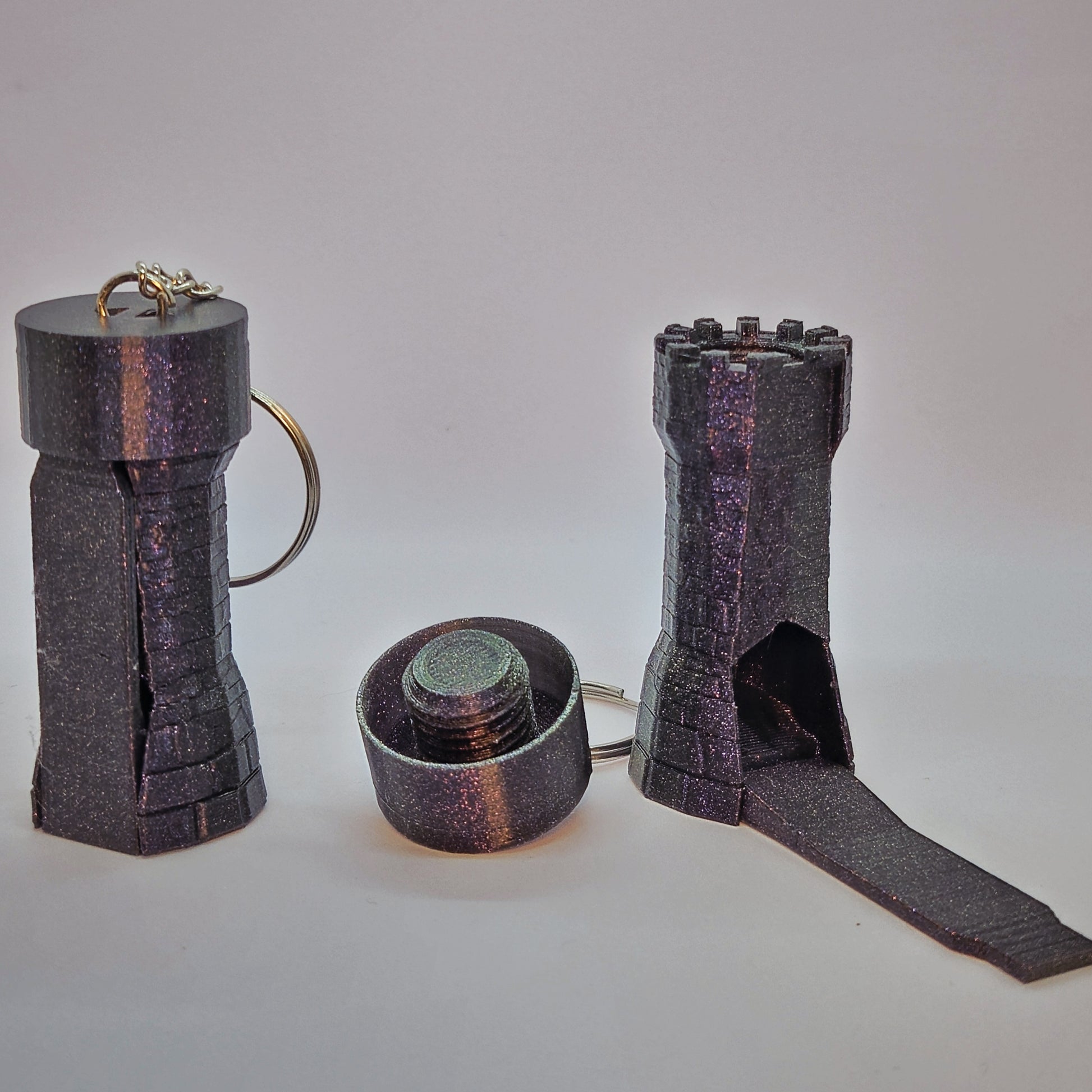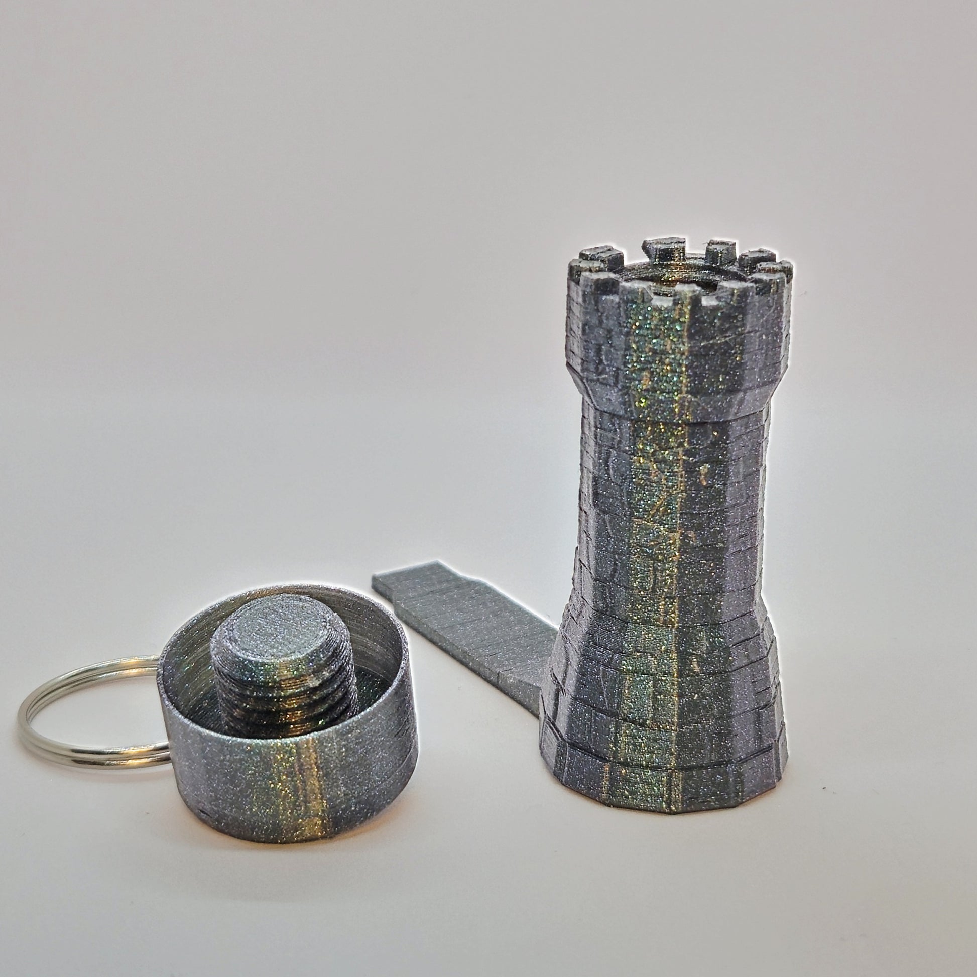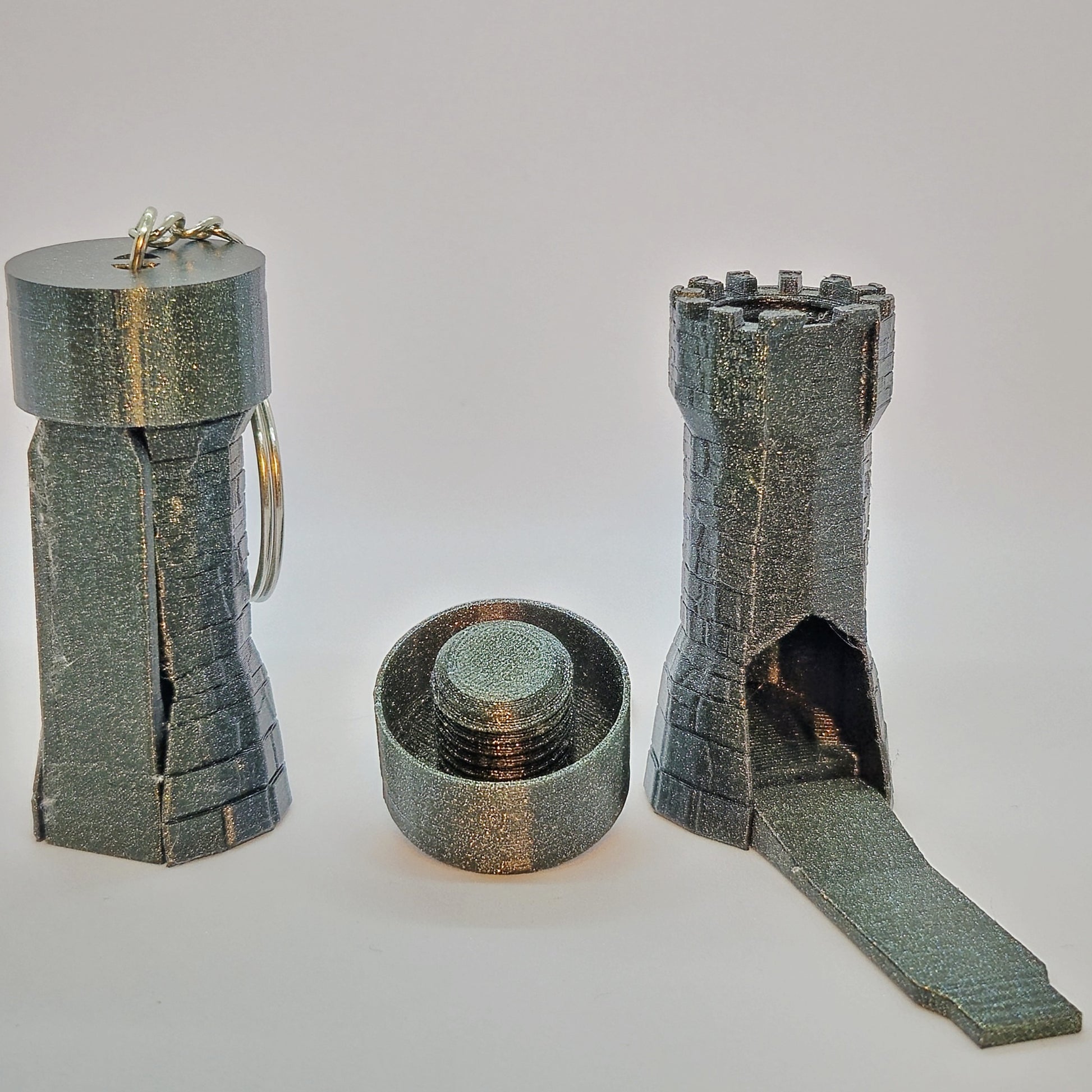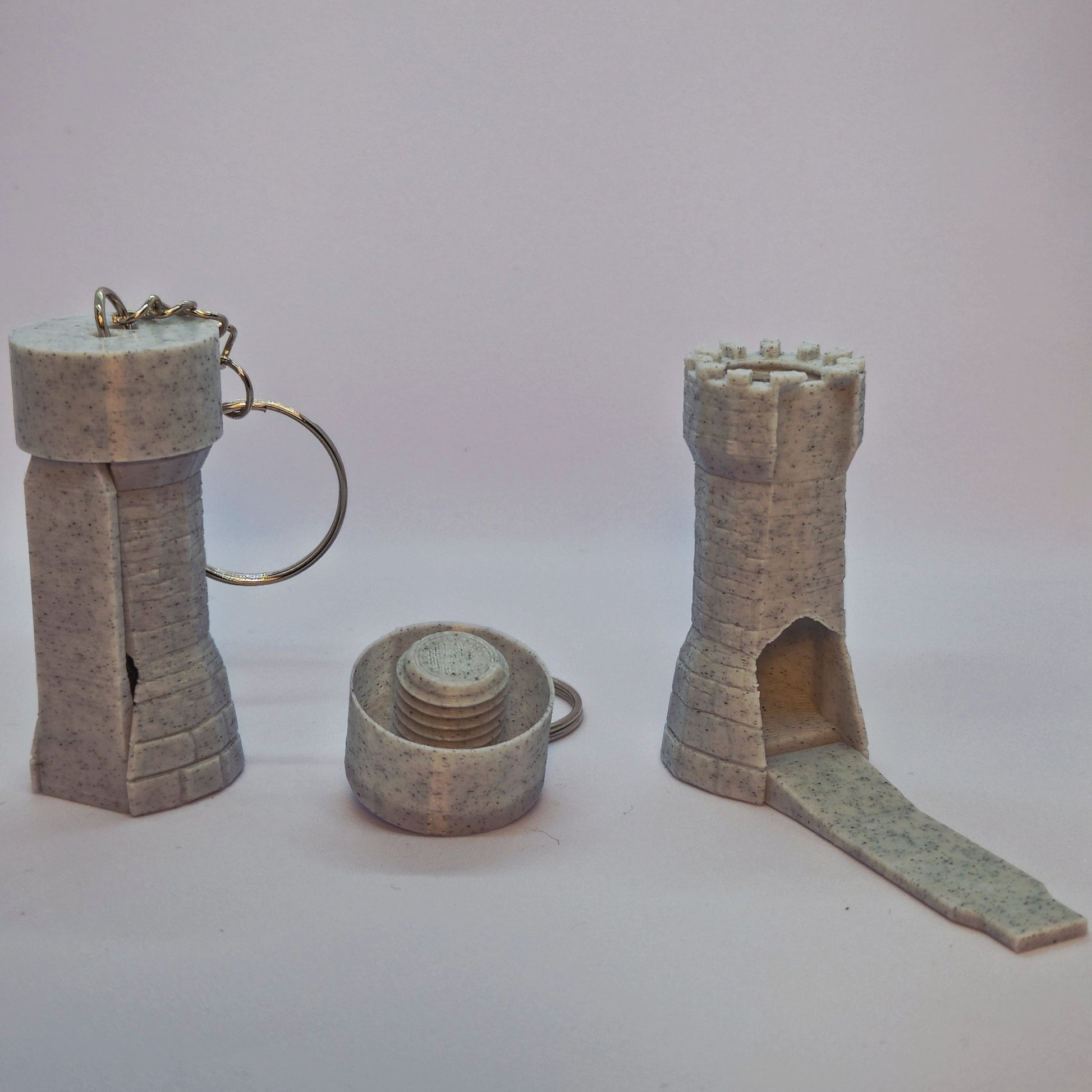This compact dice tower doubles as a secure container for a mini metal dice set (D20 diameter max. 1cm), with a threaded screw-top to keep your dice safe. Designed for convenience, it comes equipped with a sturdy keychain so it's always within reach. Despite its size, it rolls true.
